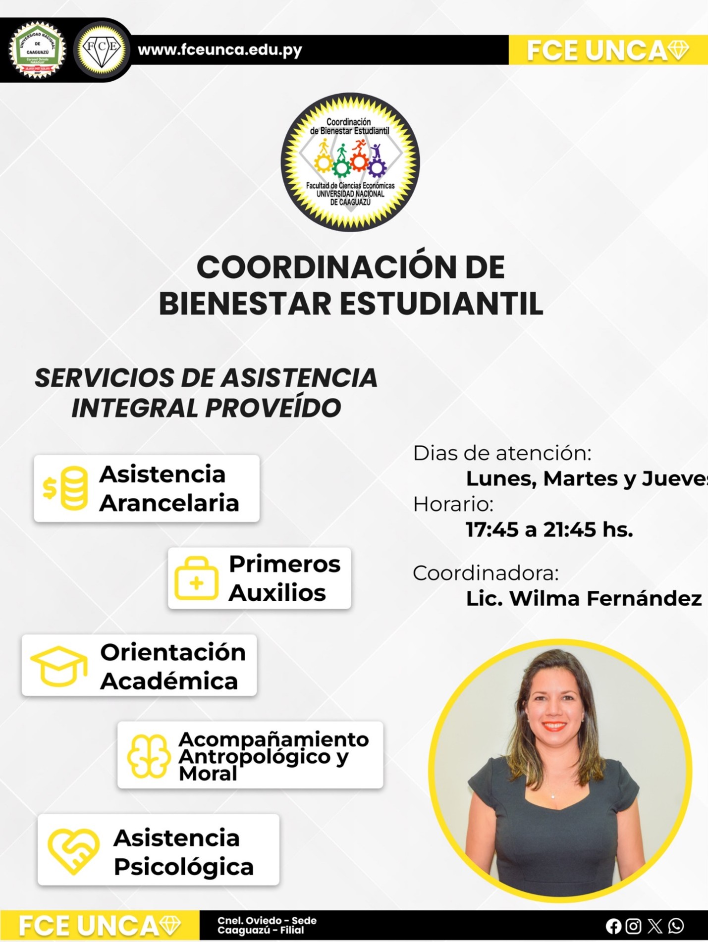 La Dirección de Bienestar Institucional de la Universidad Nacional de Caaguazú diseña y ejecuta políticas orientadas a acompañar las trayectorias estudiantiles desde el ingreso hasta el egreso, promoviendo el bienestar integral, la igualdad de oportunidades y la permanencia en la educación superior pública.